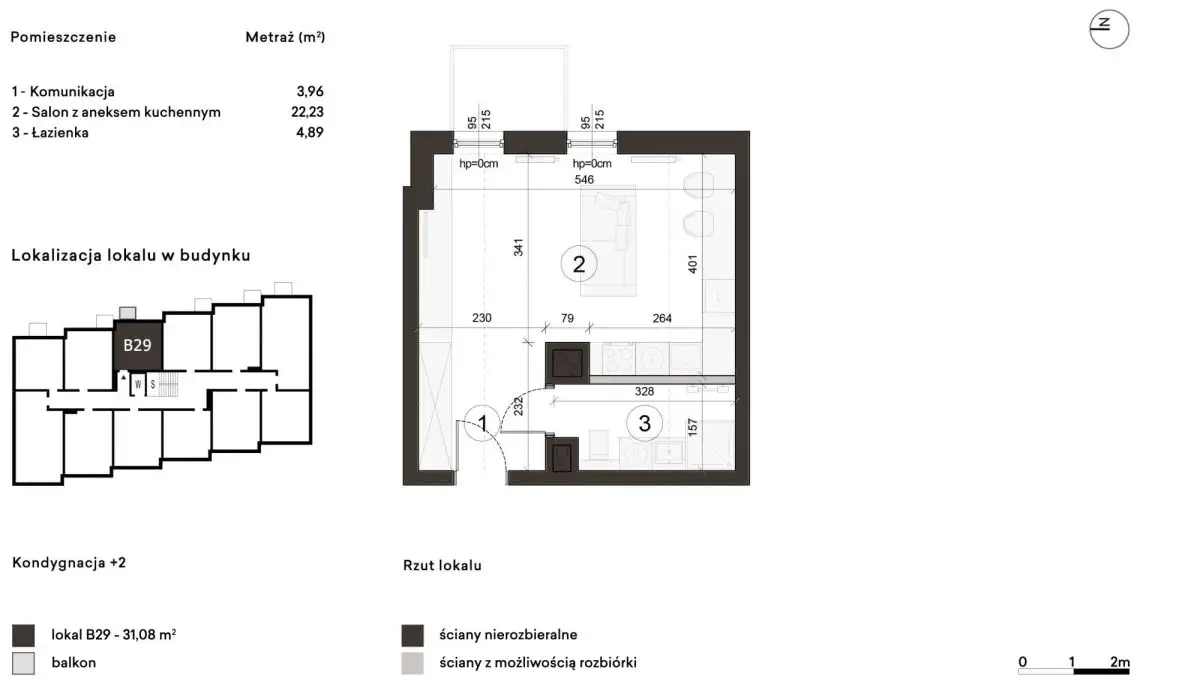 Kawalerka o powierzchni projektowej 31,08 m² położone na drugim piętrze/II w Elizówce z szybkim dojazdem do Lublina.