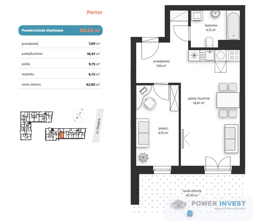 Mieszkanie znajduje się na parterze, ma powierzchnię 40,63 m² i składa się z: