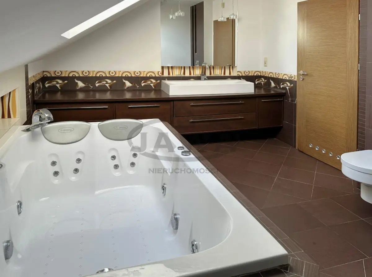 - duża łazienka (12 m²) z bardzo dużą wanną z hydromasażem (powietrznym i wodnym), umywalką na podwieszanej zabudowie Komandor, kabiną prysznicową, sedesem oraz wejściem do pralni 3,8 m²