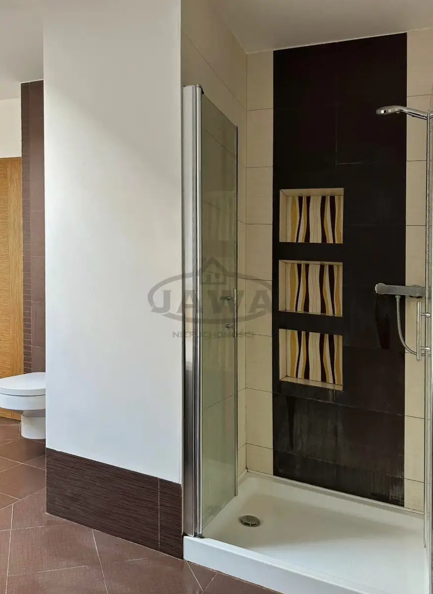 - łazienka (5,5 m²) kabina prysznicowa, umywalka, sedes, bidet, zabudowa szafek; na ścianach płytki; podłoga podgrzewana - terakota