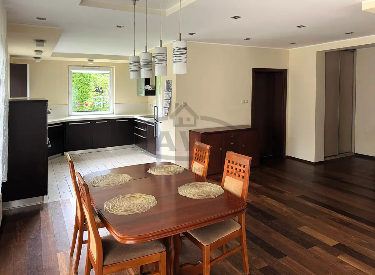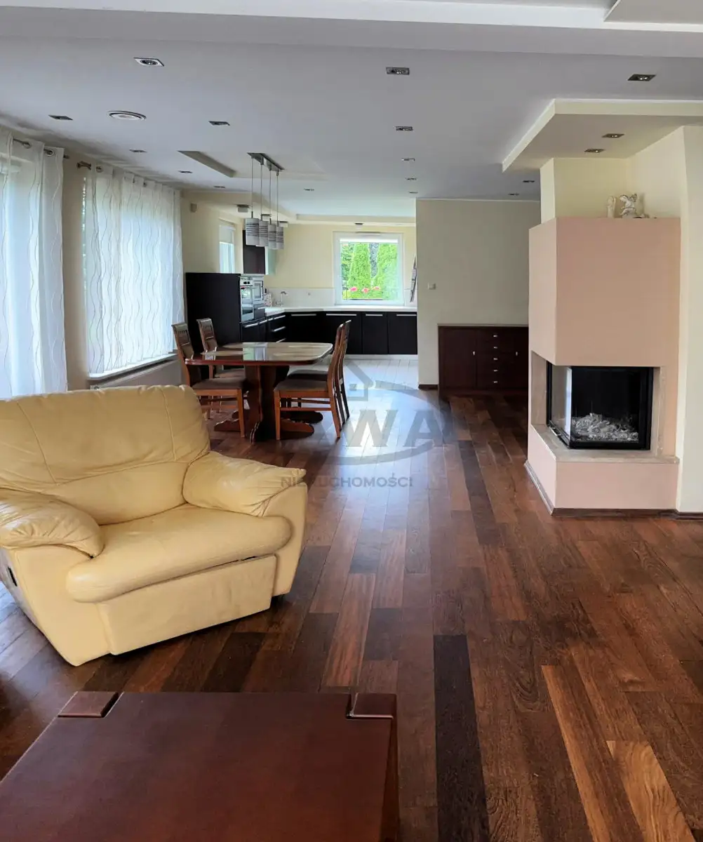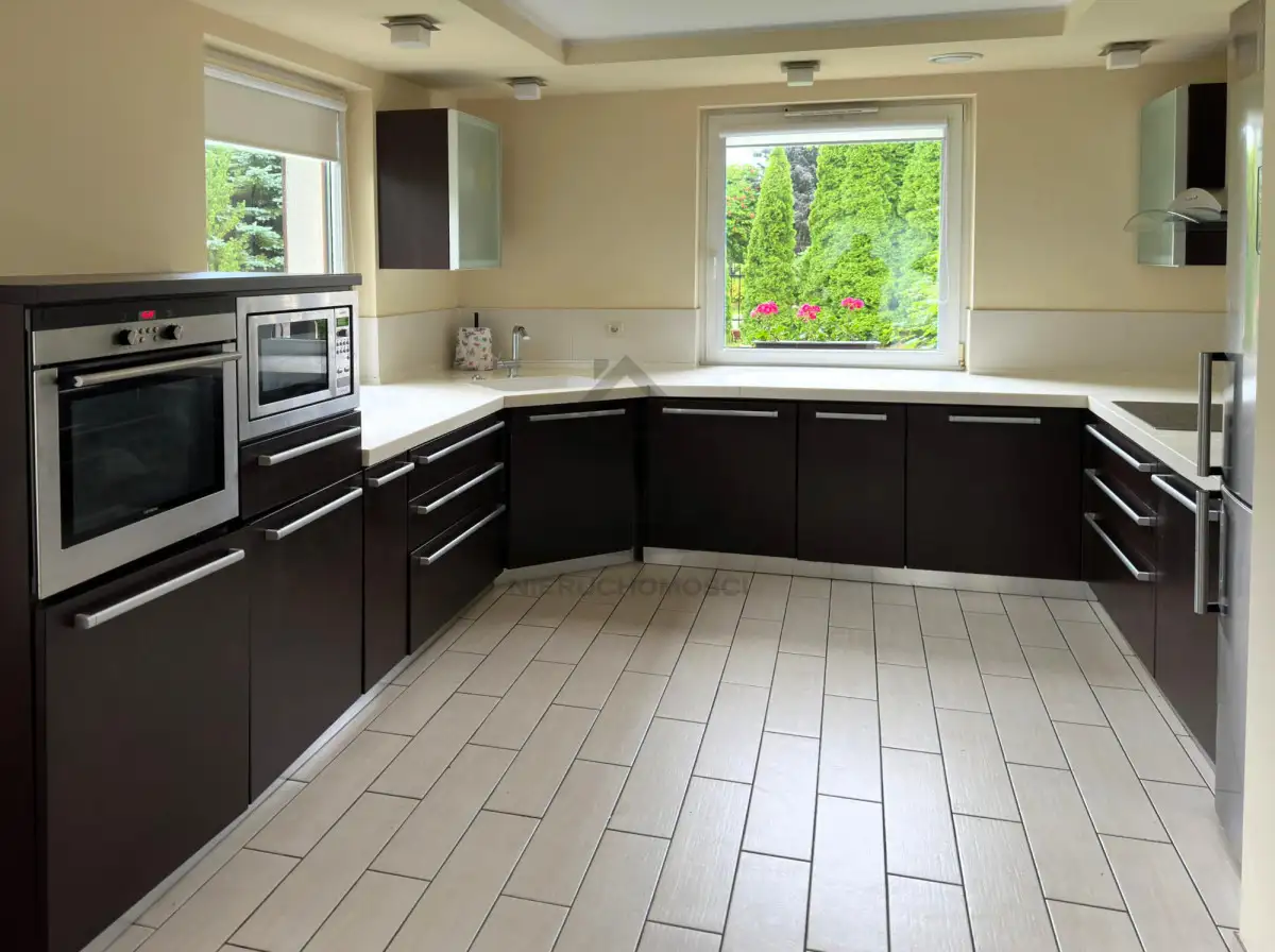 - duży salon z jadalnią (44 m²) i nowoczesną włoską kuchnią (10,6 m²): zabudowa włoska, blat konglomerat, szafki i szuflady z systemem cichego domykania; zabudowane sprzęty firmy Siemens (zmywarka, piekarnik elektryczny, płyta grzewcza, mikrofalówka); podłoga podgrzewana - terakota; w salonie kominek wolnostojący wysokiej klasy;