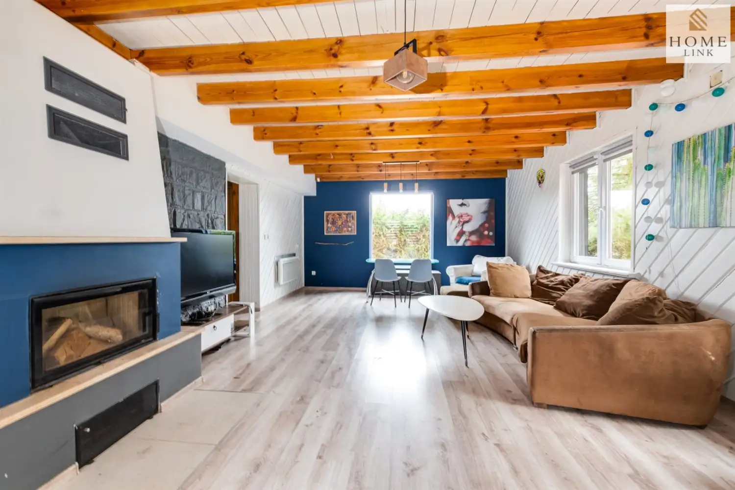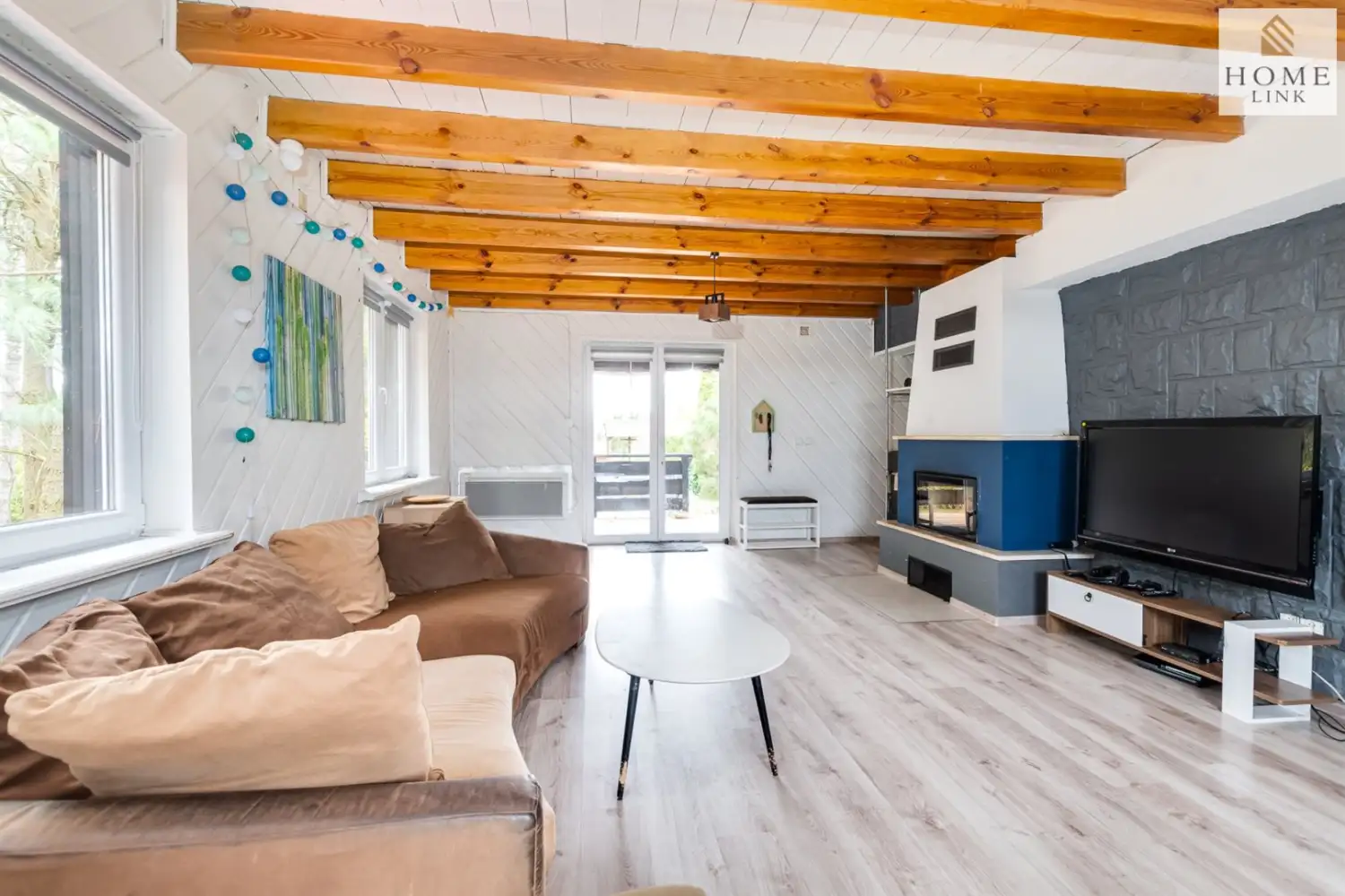 - duży salon z kominkiem - idealne miejsce na wspólne wieczory przy ogniu, rodzinne spotkania i relaks po dniu pełnym przygód, z salonu wyjście na zadaszony taras, który może być idealnym miejscem na przyjemne spędzanie czasu z rodziną i przyjaciółmi,