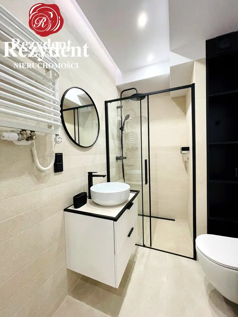 * łazienka - na wyposażeniu pralka, szafka na kosmetyki, kabina prysznicowa, umywalka oraz WC