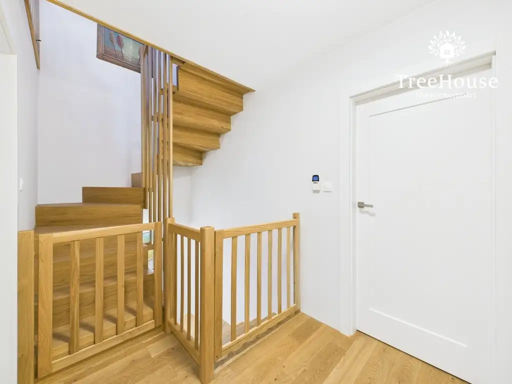 Dom został wykończony z dużą dbałością o detale i przy użyciu trwałych, naturalnych materiałów. Na podłogach ułożono dębową deskę podłogową, schody również wykonano z dębu, co nadaje wnętrzom ciepły i ponadczasowy charakter. Kamień naturalny na podłogach podkreśla elegancję i trwałość wykończenia. Kuchnia oraz stałe zabudowy zostały zaprojektowane i wykonane na wymiar, dzięki czemu idealnie dopasowują się do przestrzeni, łącząc funkcjonalność z estetyką. Całość dopełniają przytulne pokoje utrzymane w spokojnych, naturalnych kolorach, które tworzą harmonijną przestrzeń do życia.