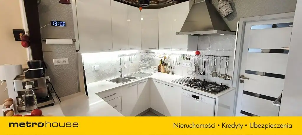 Kuchnia: Nowoczesna, z zabudową na wymiar, pojemnymi szafkami oferuje bardzo komfortową przestrzeń do przechowywania i użytkowania. W cenie wysokiej jakości sprzęt AGD: lodówka z eleganckim szklanym frontem, zmywarka i duża mikrofalówka. Praktyczny pawlacz zapewnia dodatkowe miejsce.