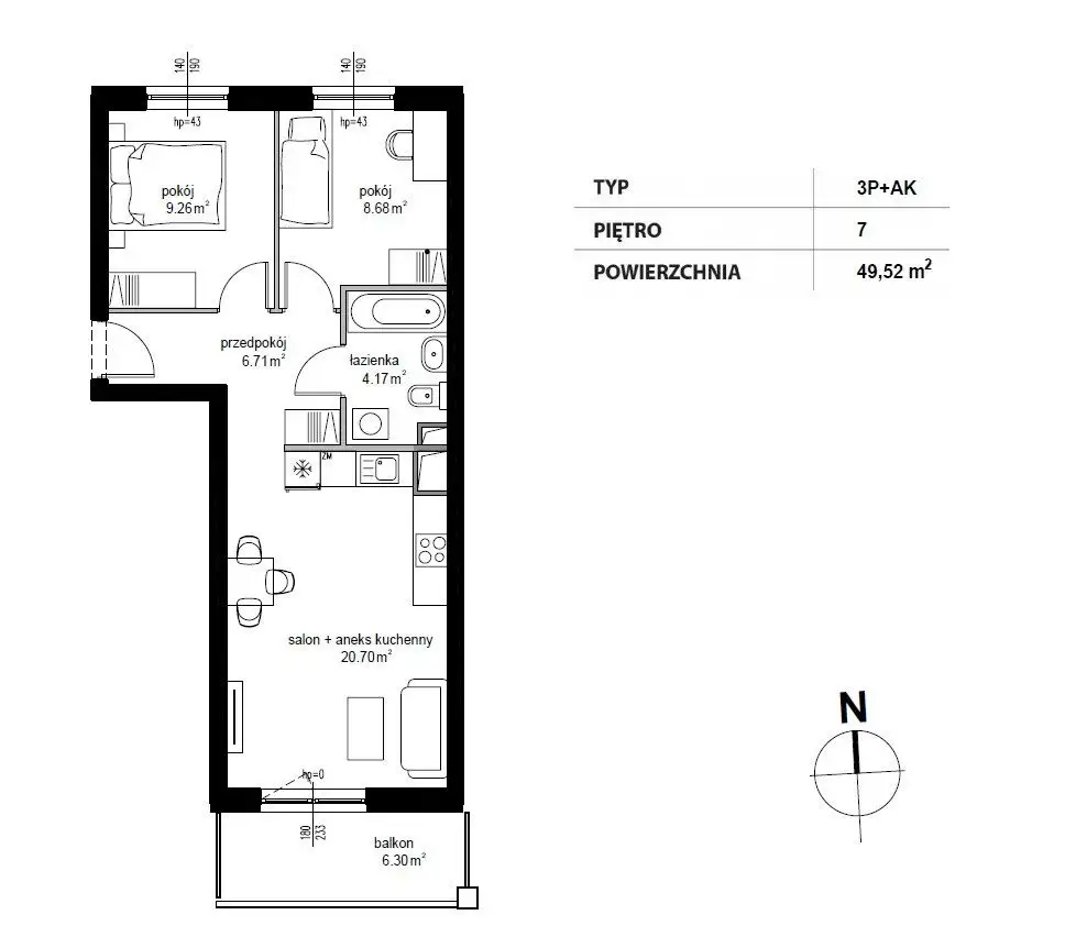 Trzypokojowe mieszkanie o powierzchni projektowej 49,52 m² na 7 piętrze w 7 piętrowym bloku na Czechowie.