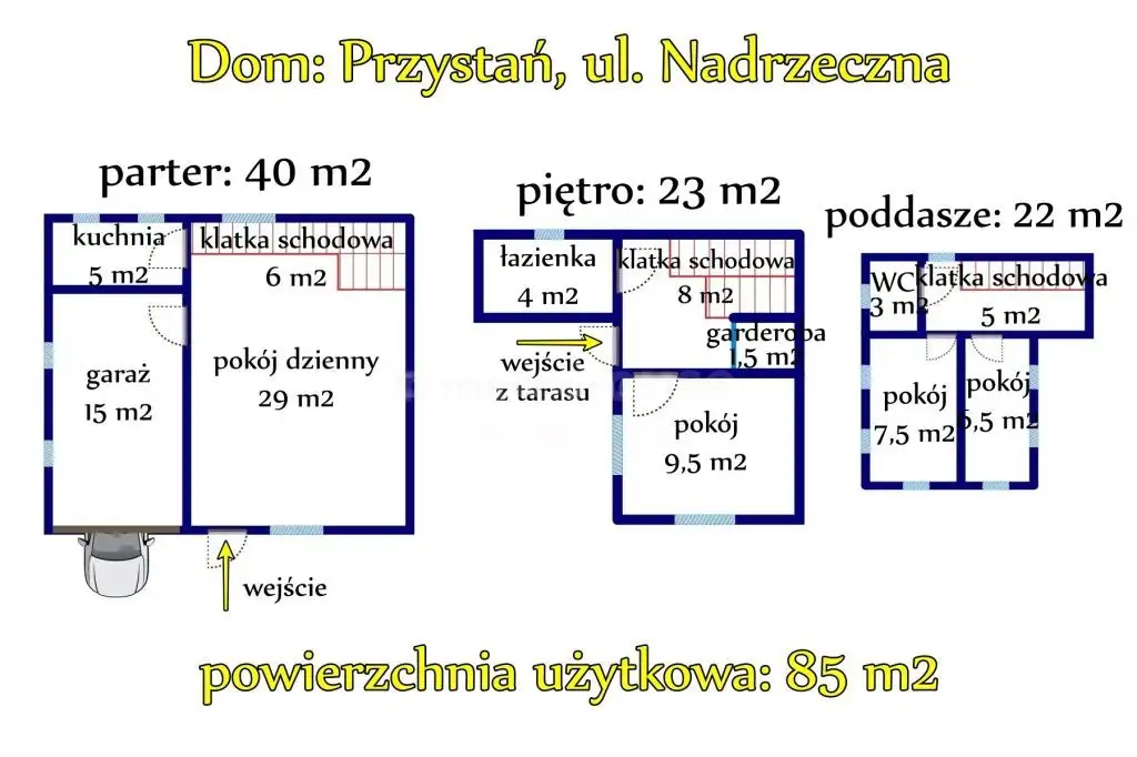 Dom o powierzchni użytkowej około 85 m² został zaprojektowany na trzech poziomach. Na parterze znajduje się przestronny, jasny pokój dzienny i kuchnia. Piętro i poddasze mieszczą trzy przytulne sypialnie, garderobę, łazienkę i WC zapewniające wygodę oraz prywatność dla całej rodziny lub gości. W bryle budynku znajduje się również garaż. Całość pokryta jest estetycznym gontem, który doskonale komponuje się z leśnym otoczeniem, podkreślając naturalny charakter domu.