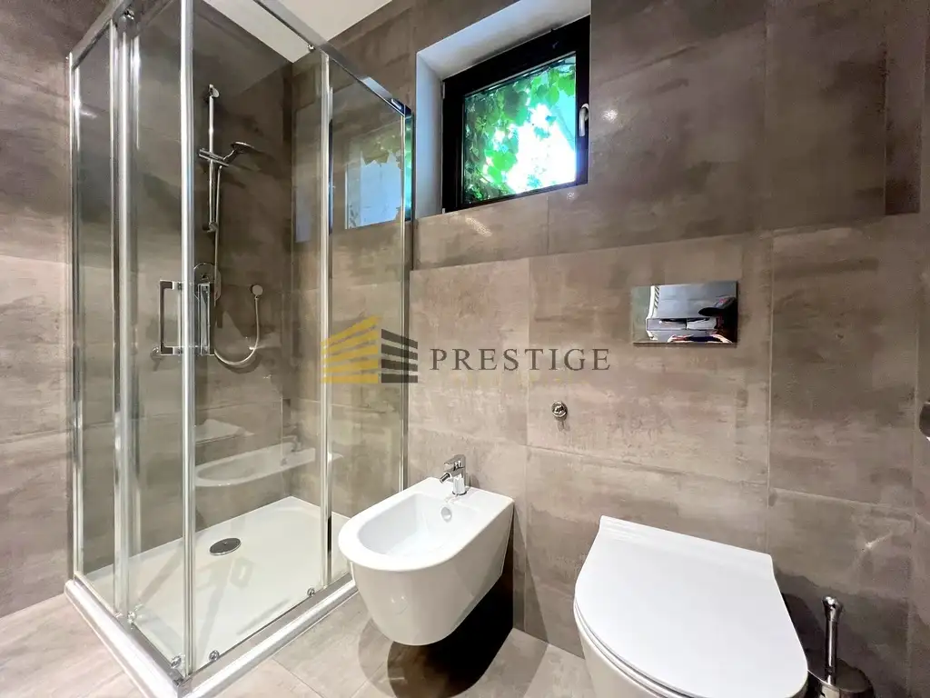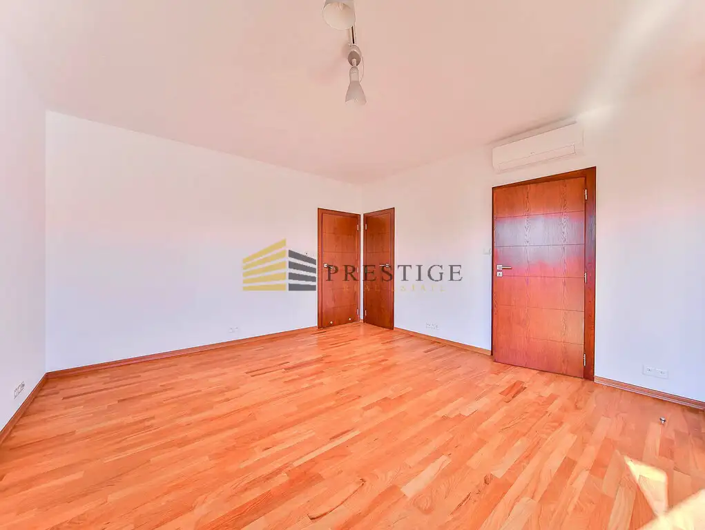 An elegant beech wood staircase leads to the first floor, where there are three spacious bedrooms, including a master bedroom with a private bathroom and a dressing room. Additionally, there is another bathroom with a bathtub and shower and an additional dressing room. From the first floor, there is also access to a carpeted attic, which is a practical storage space.