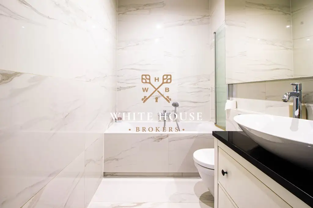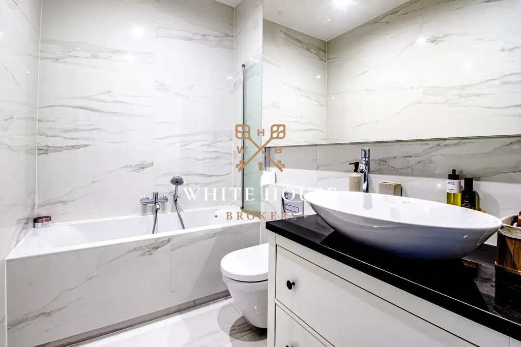 Łazienka funkcjonalna wyposażona w zabudowę meblową.