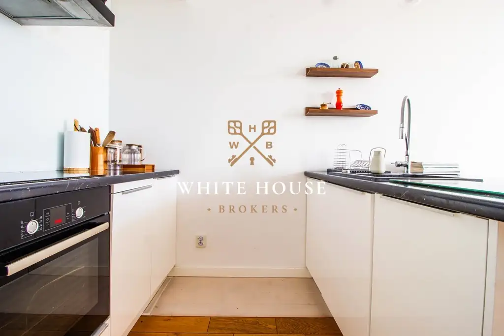 Kuchnia z meblami na wymiar i wysokiej klasy sprzętem AGD (zmywarka, płyta indukcyjna, piekarnik, lodówka i okap).