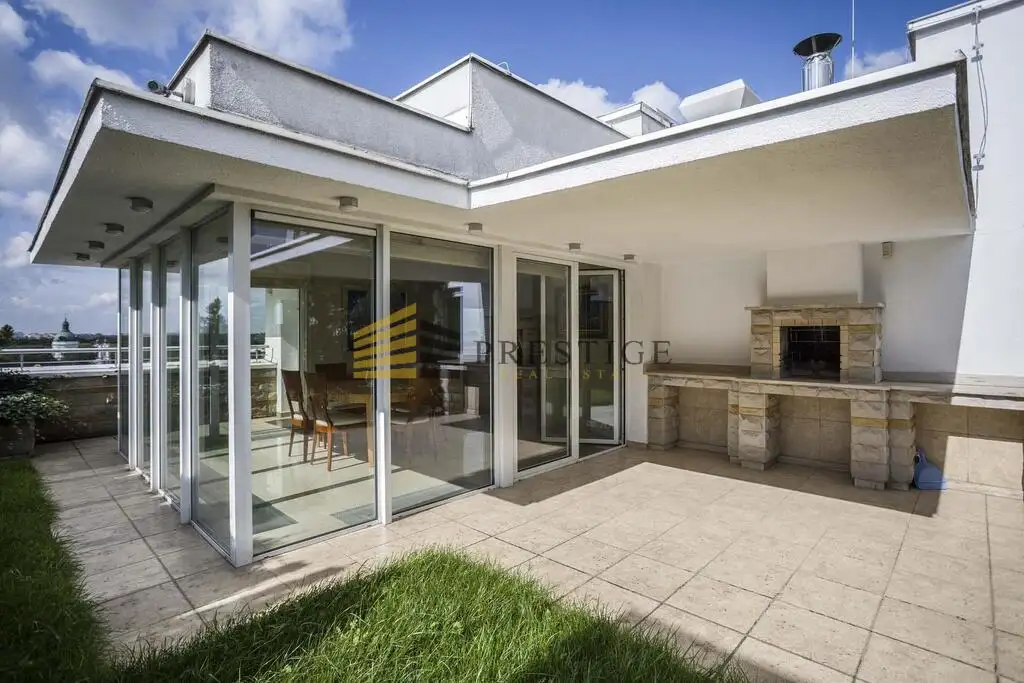 Apartment with view on three sides of the world and terrace on the top floor, very quiet, which includes: - entrance hall - Living room with dining area and kitchen - bedrooms with a living room and dressing room - a bedroom with a bathroom Guest toilet - laundry - terrace with garden, fireplace and utility room The apartment was finished to the highest standard.
