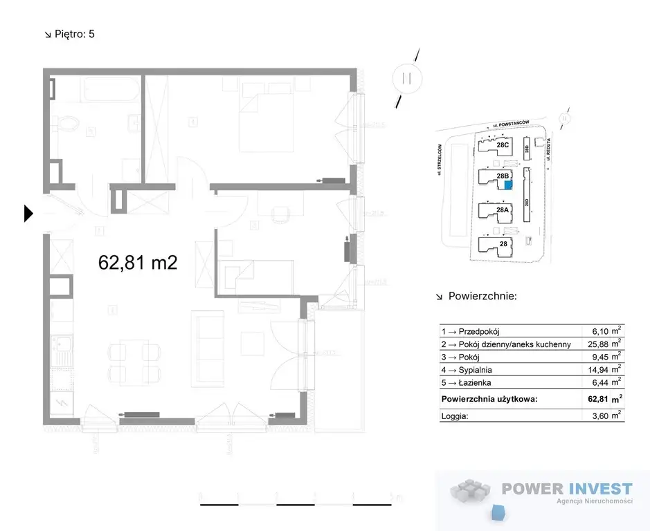 Mieszkanie znajduje się na V piętrze, ma powierzchnię 62,81 m² i składa się z: