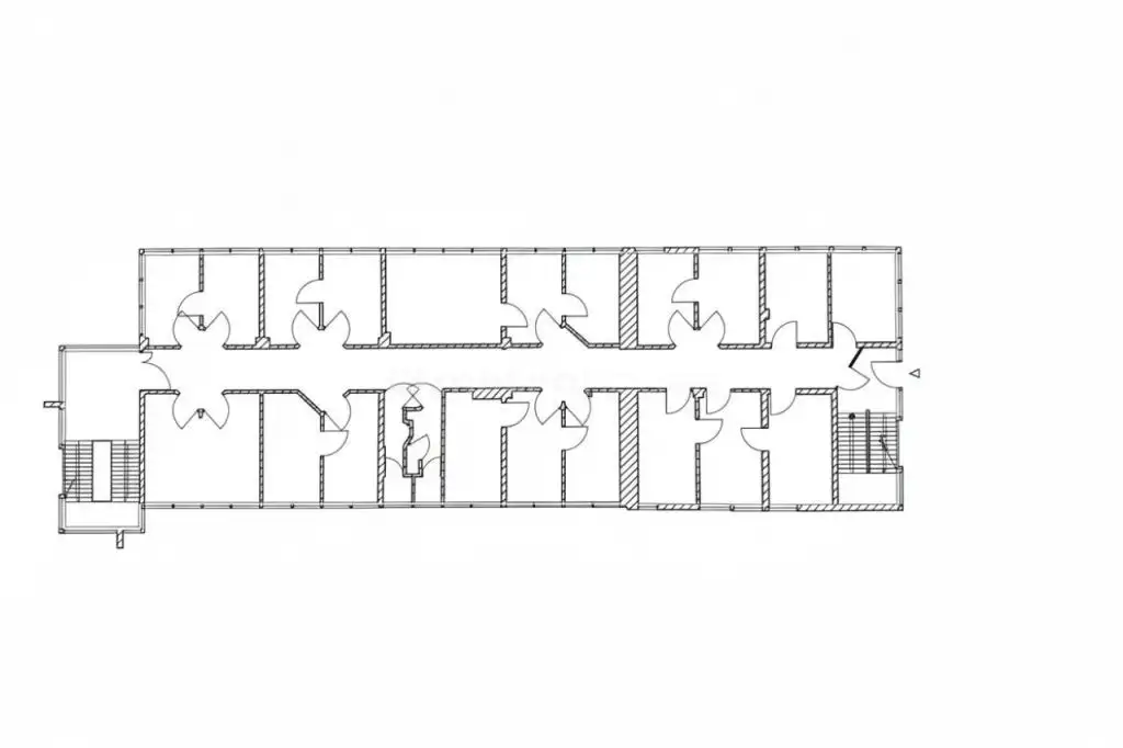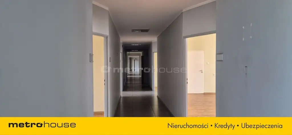 Długi korytarz łączy ze sobą kilkanaście oddzielnych pomieszczeń, co pozwala na wydzielenie stref pracy, gabinetów, sal konferencyjnych oraz zaplecza socjalnego.