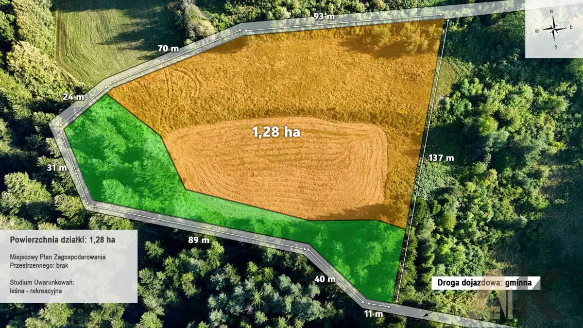 W miejscowym planie zagospodarowania przestrzennego działka oznaczona jest jako teren o przeznaczeniu leśno-rekreacyjnym, co daje potencjał do realizacji projektu rekreacyjnego, np. domku letniskowego.