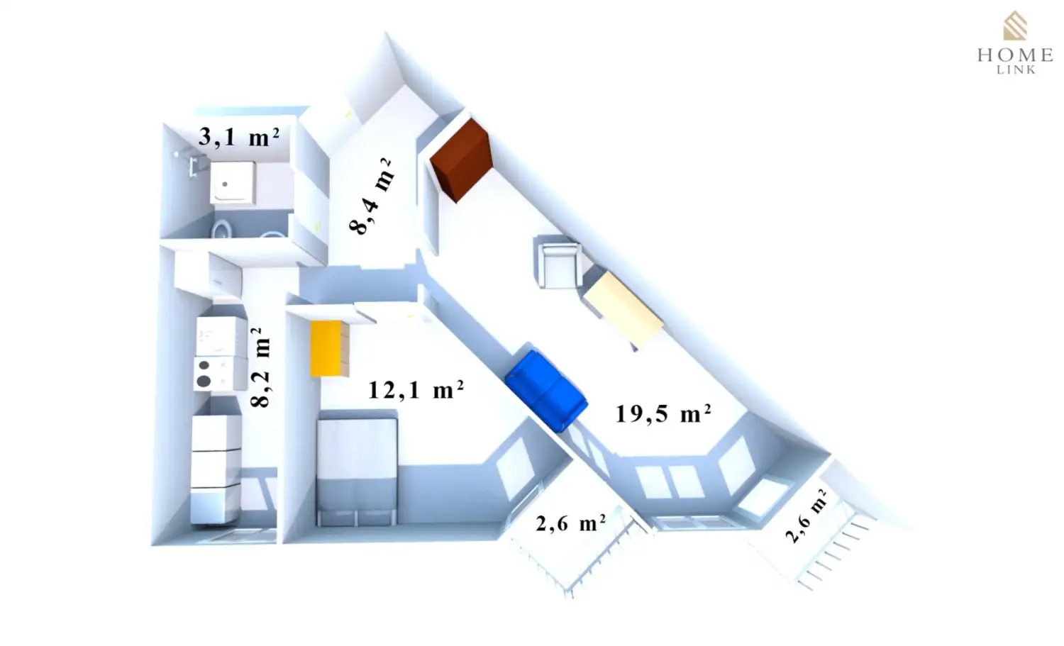 Rozkład mieszkania został przedstawiony na rzucie 3D.