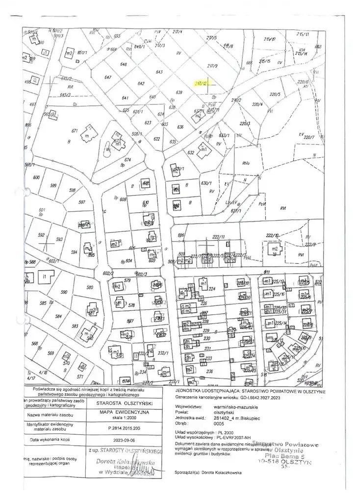 Nieruchomość położona w Biskupcu przy ul. Złotej (obręb miasto Biskupiec 5), dla której prowadzona jest księga wieczysta nr OL1B/00012738/9, oznaczona numerem działki 217/12 o powierzchni 0,1961 ha