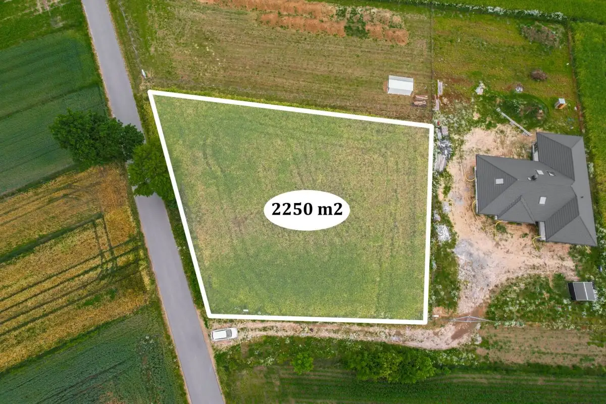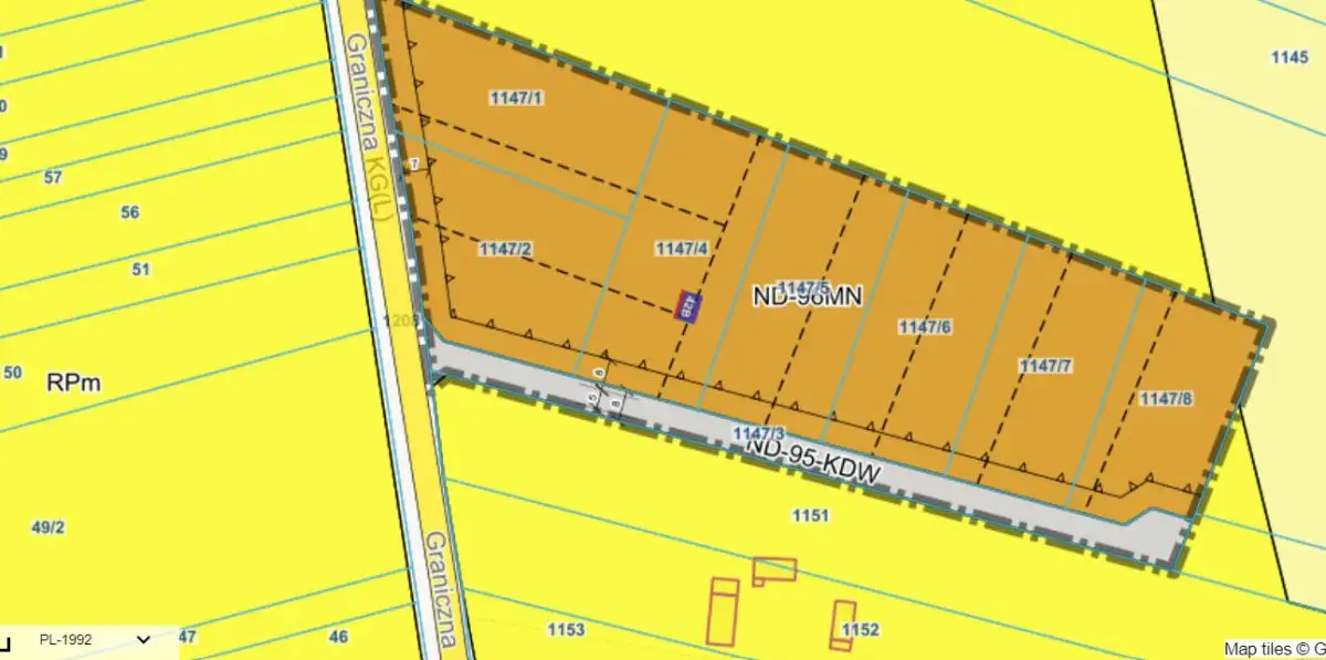Numer nieruchomości to 1147/2. Powierzchnia wynosi 2250 m² przy wymiarach ok. 62 x 48 x 35 x 42 m. Działka w kształcie trapezu.