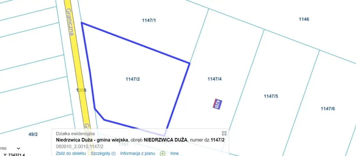 Działka w Niedrzwicy Dużej w pierwszej linii zabudowy. Numer nieruchomości to 1147/2. Powierzchnia wynosi 2250 m2 przy wymiarach ok. 62...