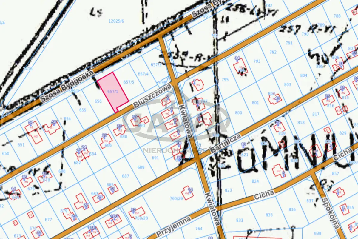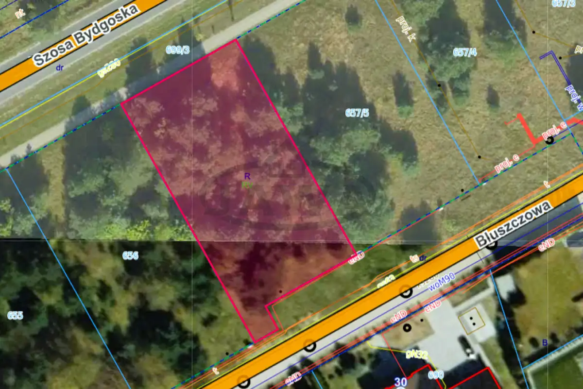 Działka budowlana na początku Łochowa jadąc od Bydgoszczy, położona pomiędzy Szosą Bydgoską a ulicą Bluszczową.