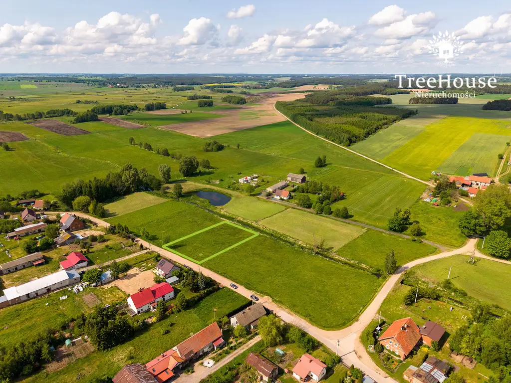 Działka w kształcie prostokąta, o wymiarach ok. 35x60 m, położona w spokojnej, zielonej okolicy.