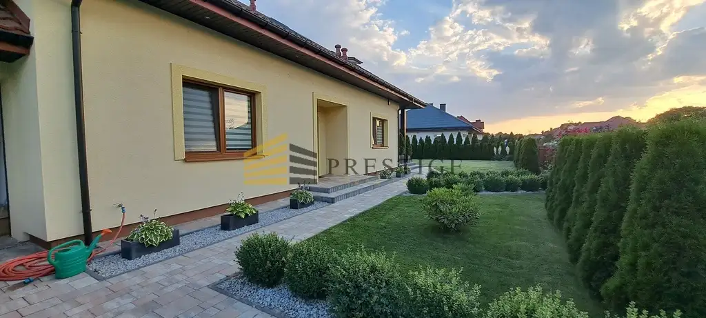 Do dyspozycji jest przepiękny, zielony i zadbany ogród, obsadzony krzewami, drzewkami owocowymi i roślinami ozdobnymi otulający dom z trzech stron: od zachodu, południa i północy; domek gospodarczy/ogrodowy o powierzchni ok 20m², garaż z odpływem przy bramie( + stryszek nad garażem) i miejsca na 2-3 auta na podjeździe, altanka śmietnikowa.