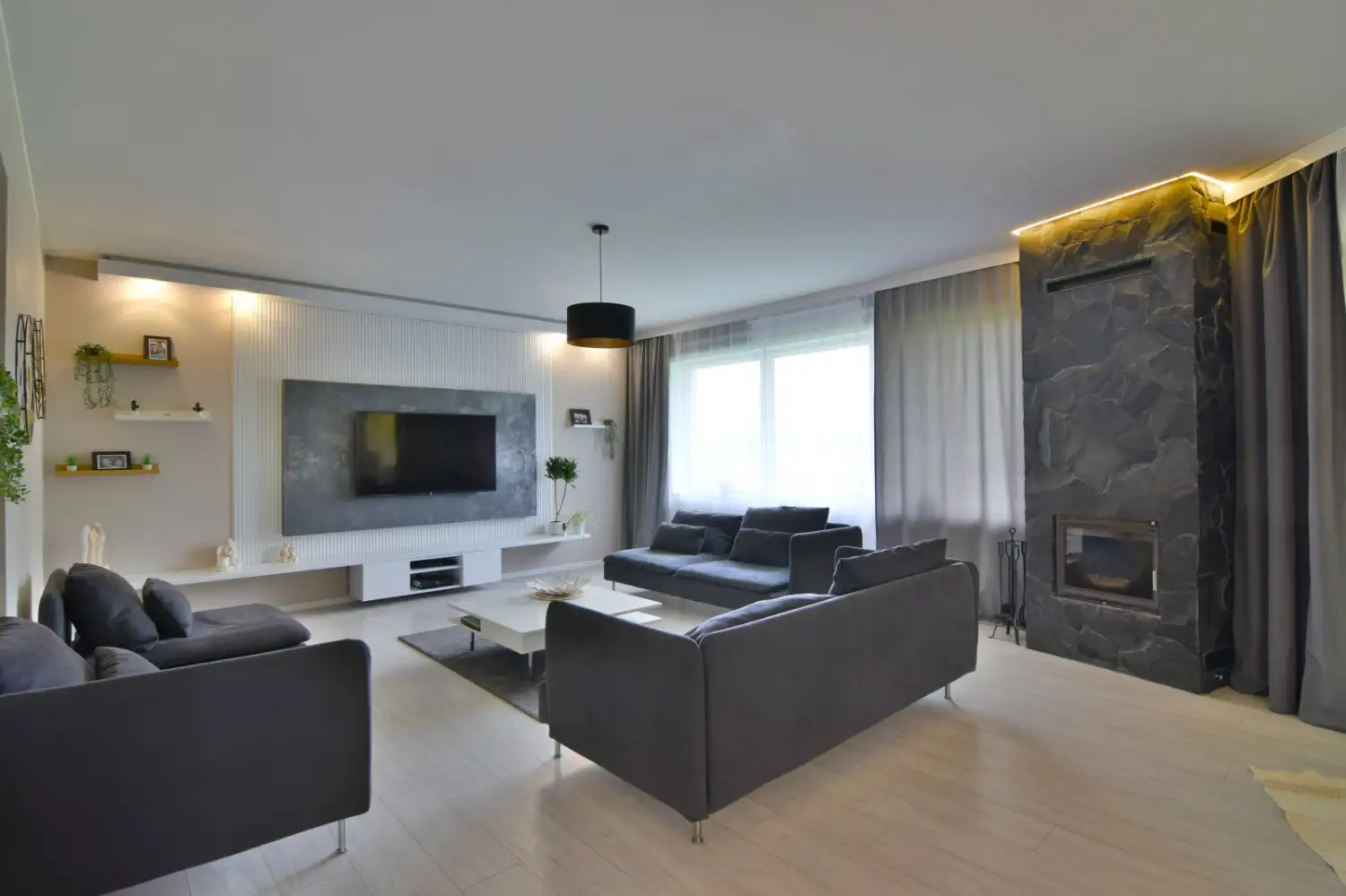 - przestronny salon z kominkiem i dużym, zadaszonym tarasem - idealny na poranną kawę lub wieczorny odpoczynek,