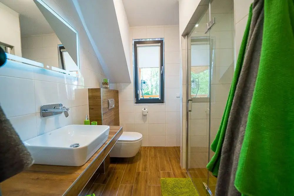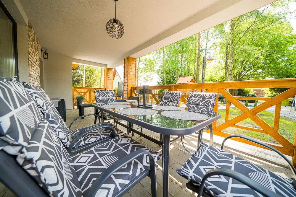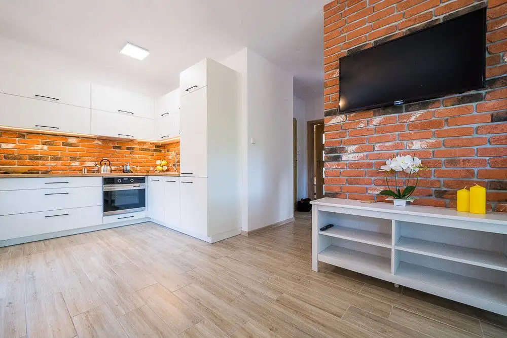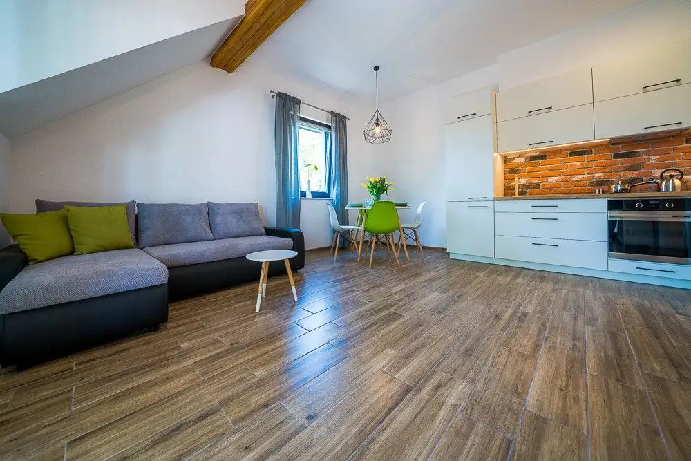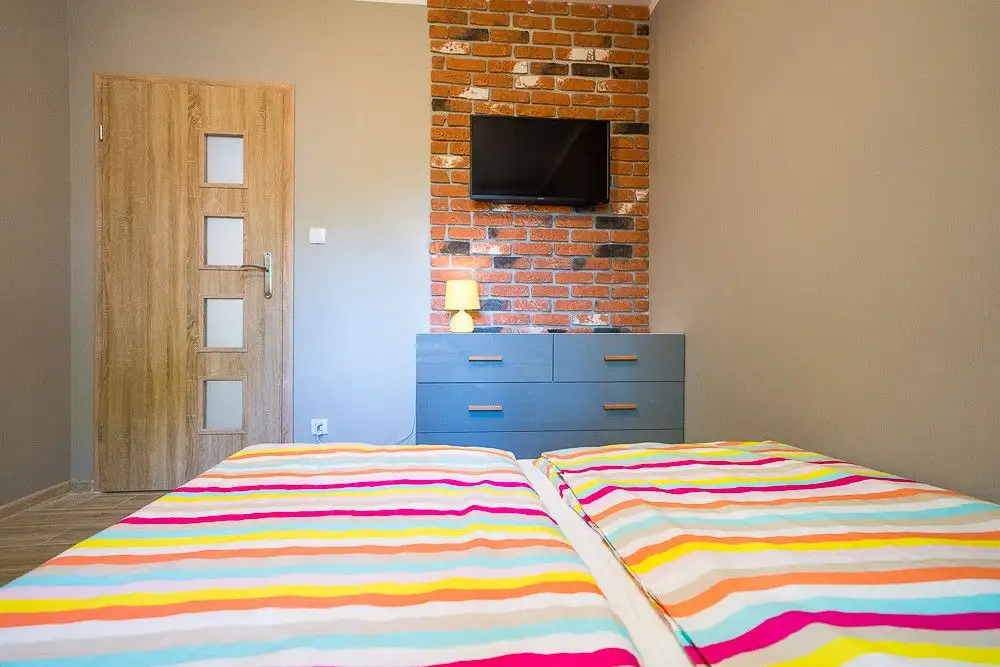 Funkcjonujący pensjonat składa się z czterech umeblowanych, apartamentów, każdy z nich posiada zabudowę kuchenną wraz ze sprzętem AGD,(lodówka, płyta indukcyjna, piekarnik, okap, zmywarka). W każdym apartamencie znajdzie się miejsce dla 6 osób.