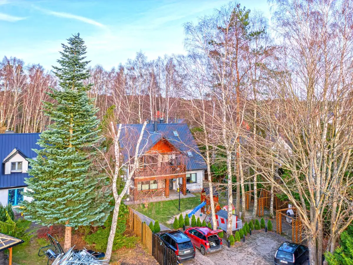 Posesja ogrodzona, plac zabaw dla dzieci, teren zalesiony - starodrzew, brama na pilota do pensjonatu, droga dojazdowa zamykana na dodatkową bramę tylko dla mieszkańców ulicy Topolowej.