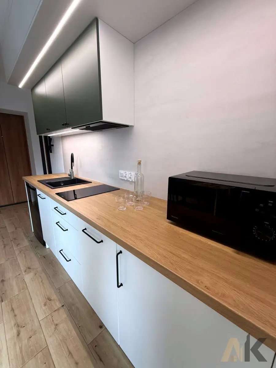 *kuchnia - aneks kuchenny - zabudowa kuchenna z podświetleniem led, lodówka, mikrofalówka, płyta indukcyjna, okap