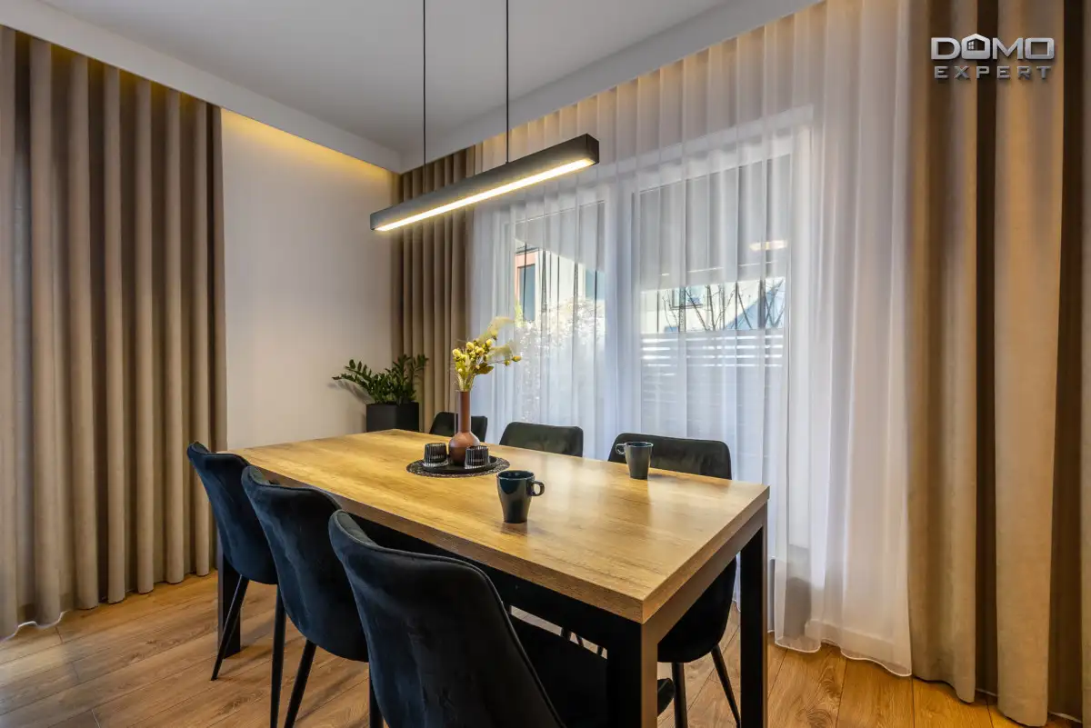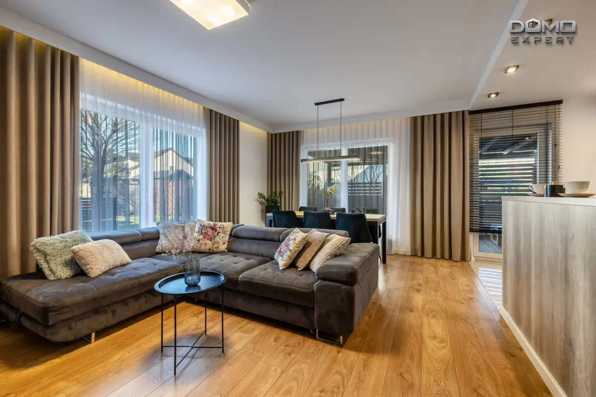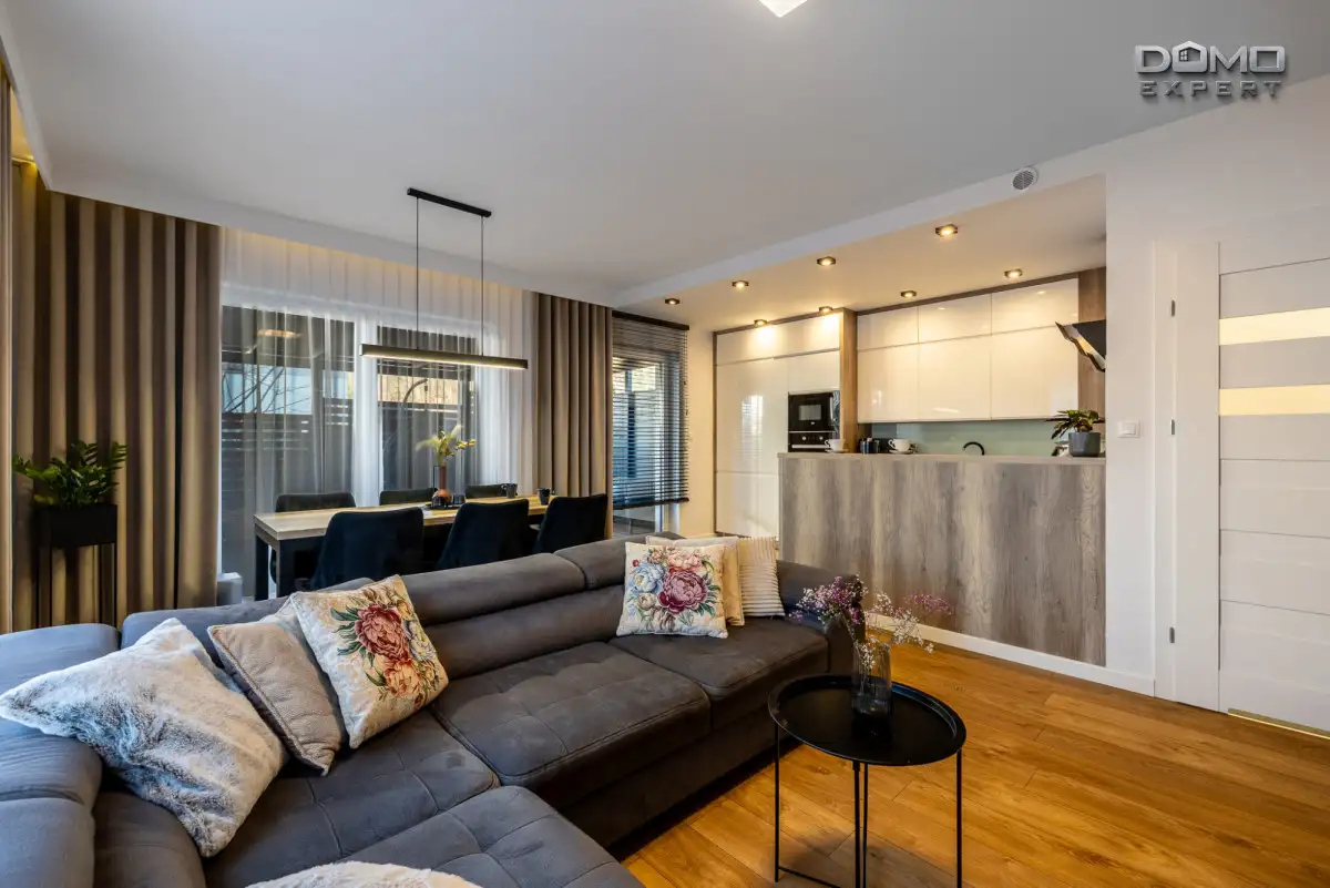 Wnętrze mieszkania zostało wykończone z dużą dbałością o detale, co widać już w otwartej strefie dziennej. Przestronny salon połączony z jadalnią i stylową kuchnią tworzy harmonijną całość, w której zastosowano spójną kolorystykę, wysokiej jakości materiały oraz nowoczesne oświetlenie. Duże okna zapewniają świetne doświetlenie wnętrza i przyjazną atmosferę przez cały dzień.