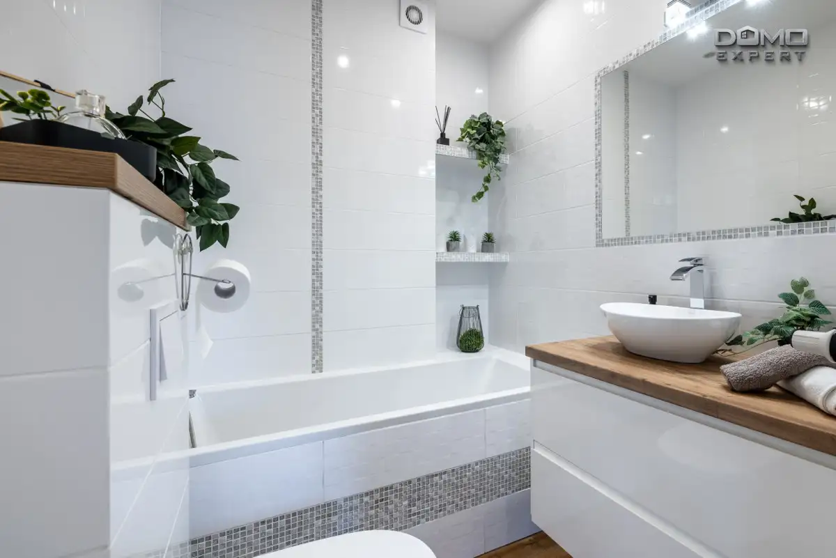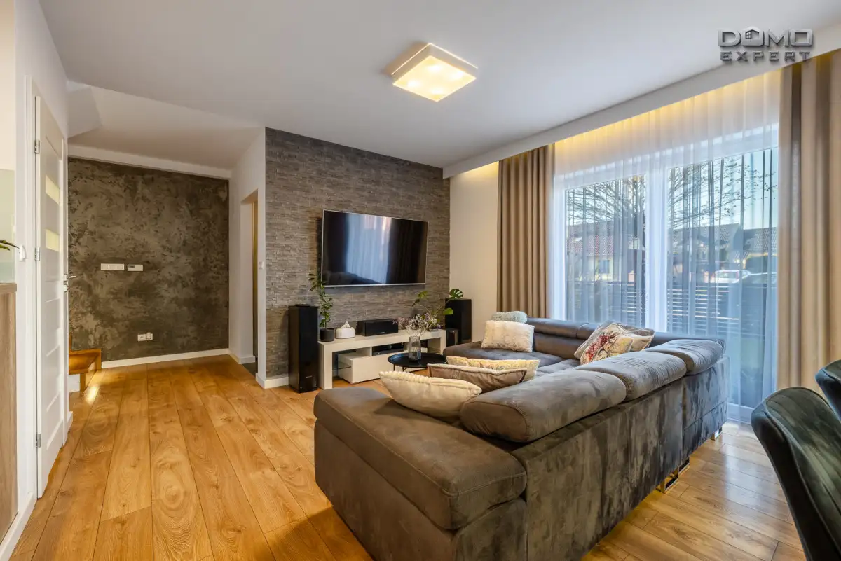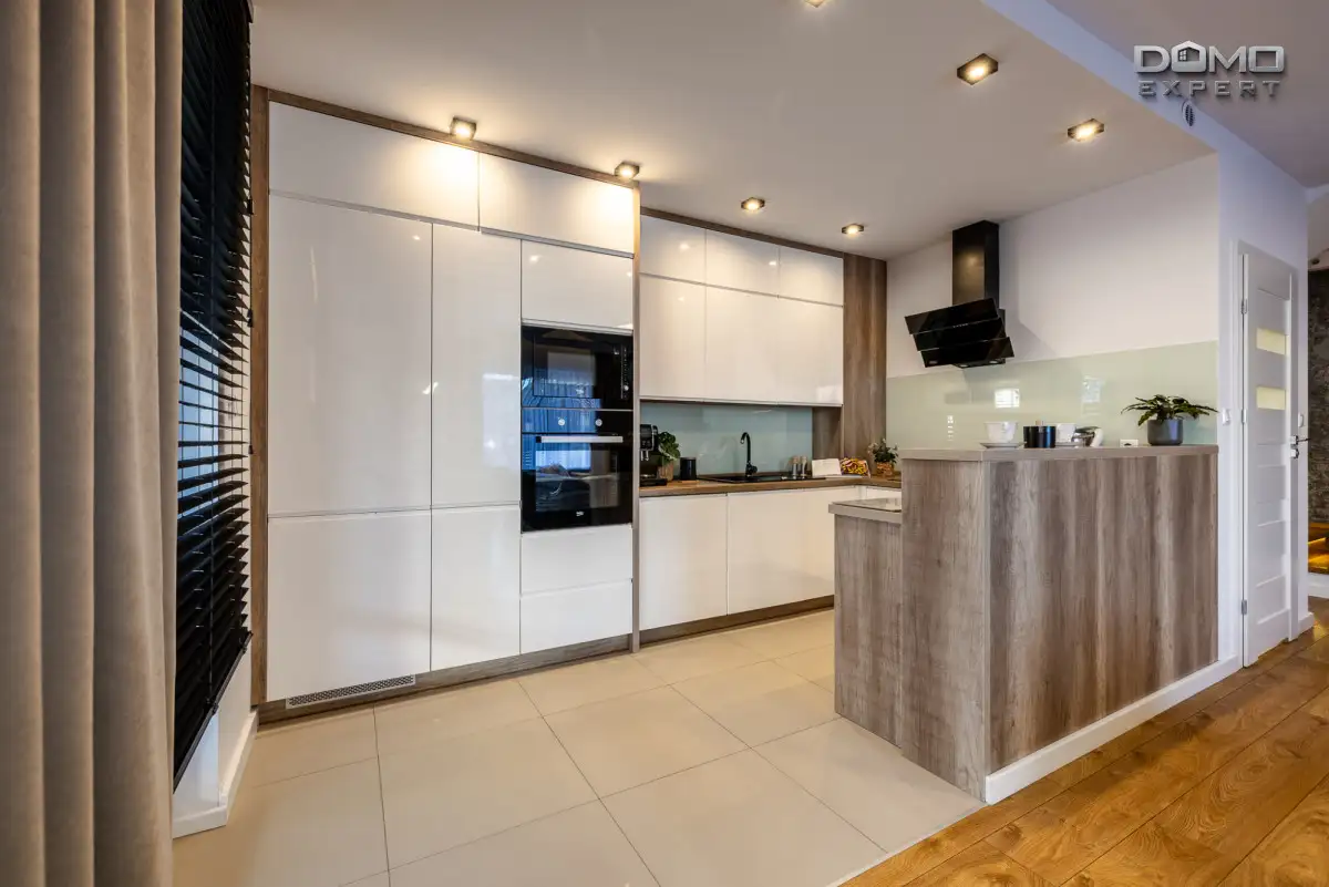 Otwarta kuchnia w jasnej zabudowie, wykonana z połączenia drewna i bieli, tworzy efekt lekkiej, nowoczesnej przestrzeni. Salon z wygodną sofą, telewizorem i miejscem do relaksu świetnie komponuje się z elegancką strefą jadalnianą.