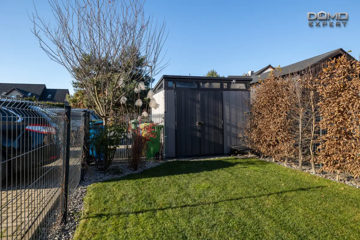 domek gospodarczy, który zapewnia dodatkową przestrzeń do przechowywania.