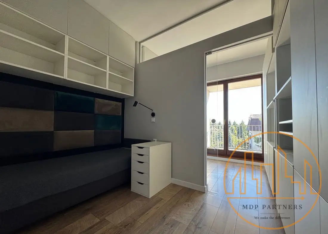 Druga sypialnia podzielona lekką ścianką gipsowo - kartonową z przeszkleniem w górnym pasie oraz suwanymi szklanymi drzwiami. Taki podział zapewnia mnóstwo możliwości - idealne dla rodzeństwa, pracy zdalnej.