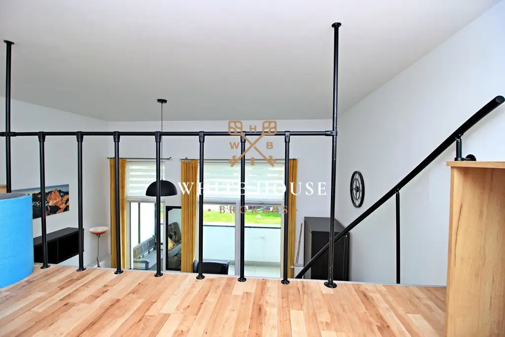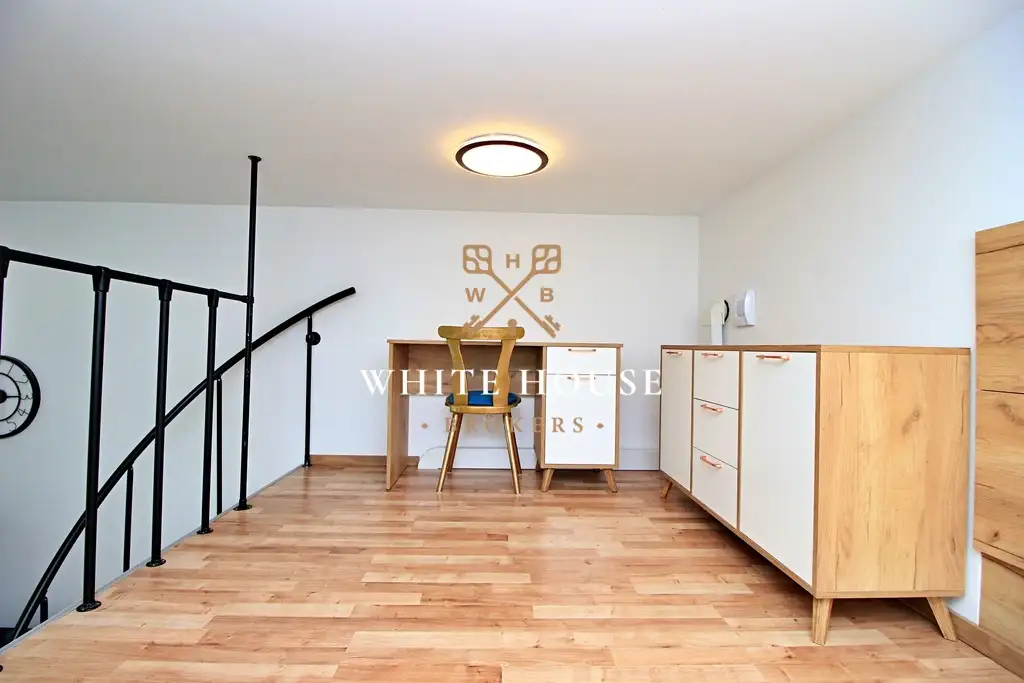 - antresoli 12 m² (wyposażenie: duże łożko z materacem, szafki, komoda, schowki, biurko, krzesło),