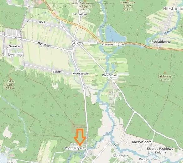 Działka położona w lesie, w Kubach Młyny (Podmarzysze), gm. Morawica, 10 km od centrum Kielc jadąc przez Suków.