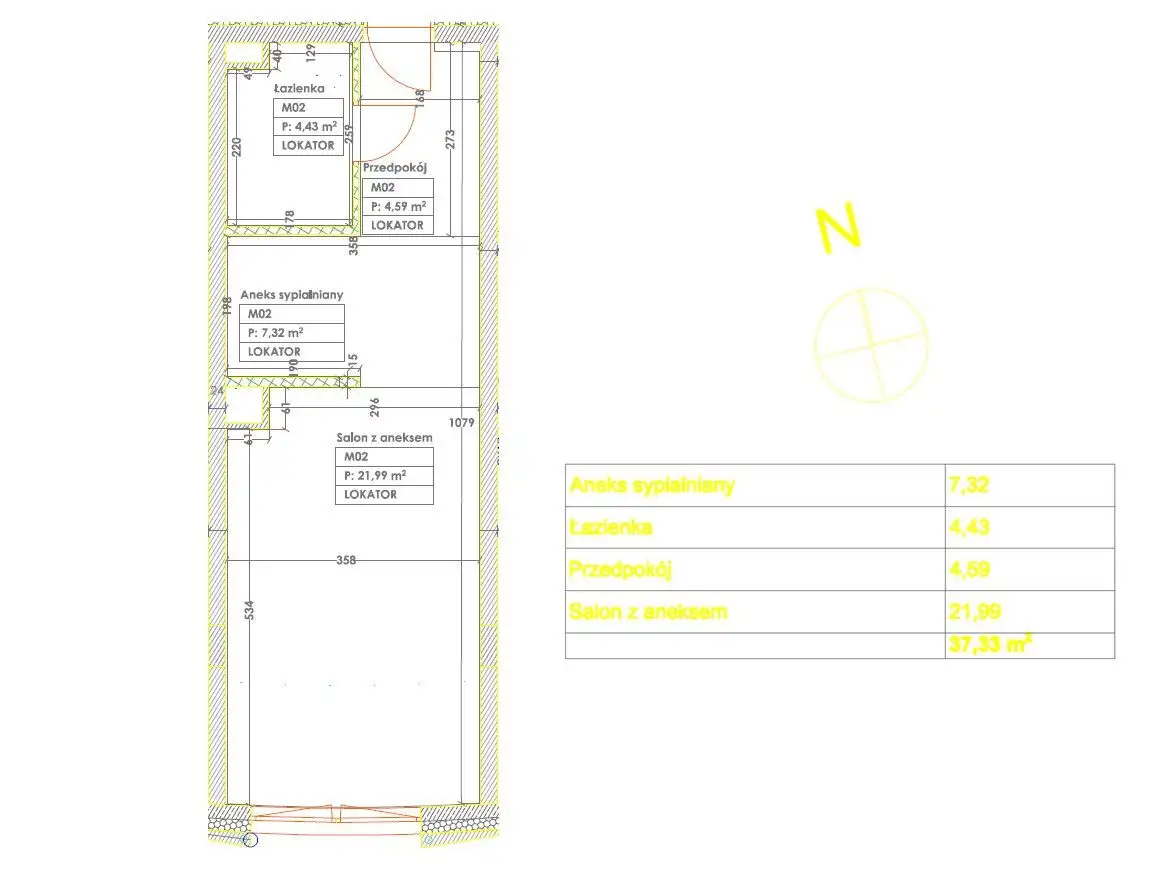 Układ pomieszczeń:• Pokój dzienny z aneksem kuchennym - 21,99 m²