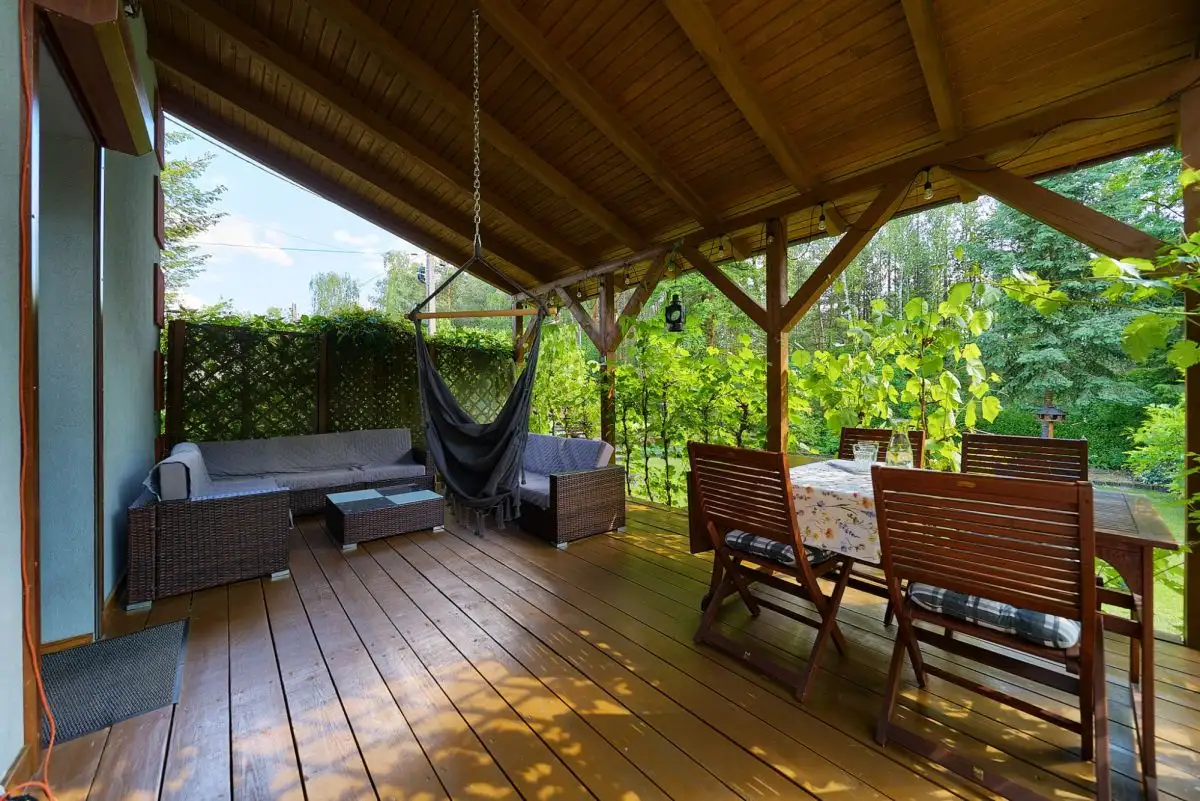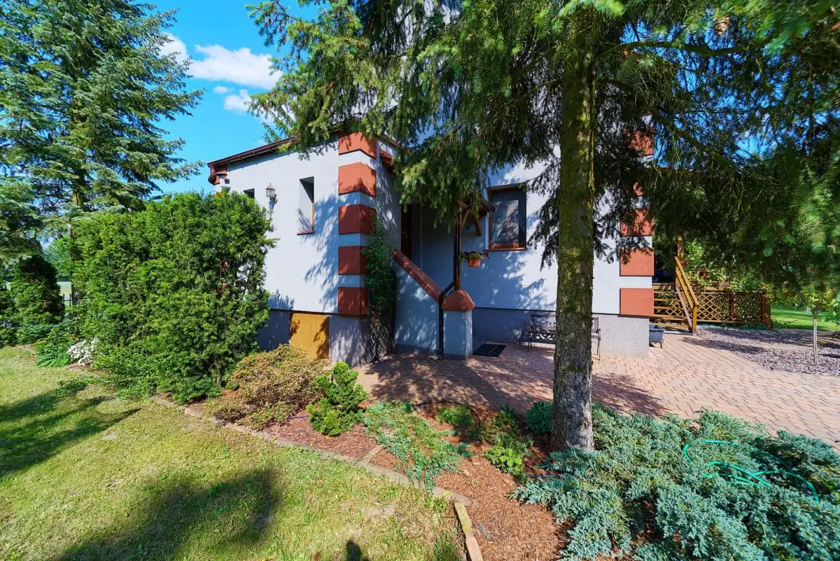 Twoja Prywatna Oaza: 24 Ary Ogrodu w Objęciach LasuNieruchomość posadowiona jest na imponującej, 24-arowej działce (2400 mkw), która jest dużym atutem tej posiadłości. Teren został w całości starannie zagospodarowany - znajdziemy tu piękne, wieloletnie drzewa, rozległy, równo przystrzyżony trawnik oraz mnóstwo miejsca na rekreację, zabawę czy uprawę własnego ogródka. Niezaprzeczalnym atutem jest fakt, że działka bezpośrednio graniczy z lasami państwowymi. Gwarantuje to nie tylko piękne widoki, ale przede wszystkim pewność, że krajobraz za Państwa oknem nie zostanie zasłonięty przez nową zabudowę.