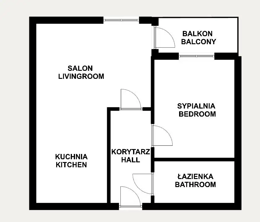 Pokoje: Sypialnia, salon, otwarta kuchnia, przedpokój, łazienka, balkon typu loggia