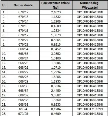 1. W skład mienia objętego aukcją wchodzi nieruchomość gruntowa niezabudowana, położona w województwie opolskim, powiat miasto Opole, jednostka ewidencyjna miasto Opole, obręb ewidencyjny 166101_1.0147, Wrzoski, w mieście Opole, w Podstrefie Opole-Wrzoski Wałbrzyskiej Specjalnej Strefy Ekonomicznej INVEST-PARK, będąca własnością WSSE „INVEST-PARK” sp. z o.o., o powierzchni całkowitej 30,2387 ha, składająca się z działek gruntu o numerach wskazanych poniżej w tabeli, dla której Sąd Rejonowy w Opolu, VI Wydział Ksiąg Wieczystych prowadzi księgi wieczyste o numerach: OP1O/00164138/8 oraz OP1O/00171892/3 (przy czym działki o numerach 670/25, 670/27, 670/29, 668/54, 668/56, 668/57, 668/59, 668/61 oraz 618/4 powstały w wyniku podziału działek objętych ww. księgami wieczystymi, a ich aktualne numery ewidencyjnie nie zostały jeszcze wpisane do księgi wieczystej), zwana dalej „Nieruchomością”.