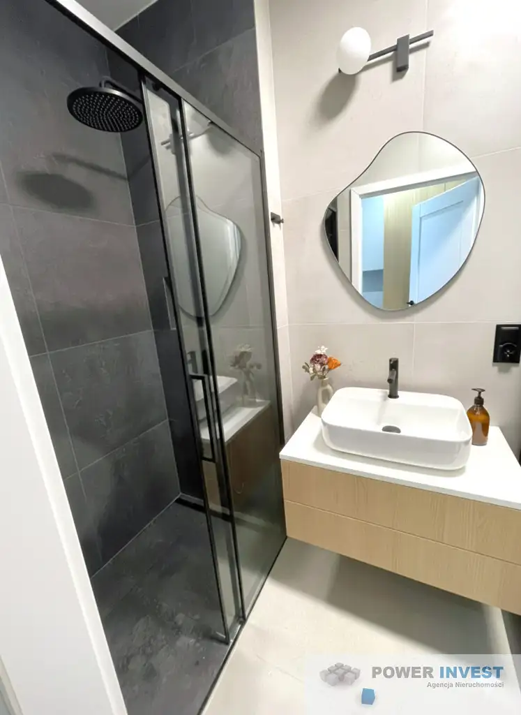 Łazienka wyposażona w kabinę prysznicową oraz szafkę z umywalką.