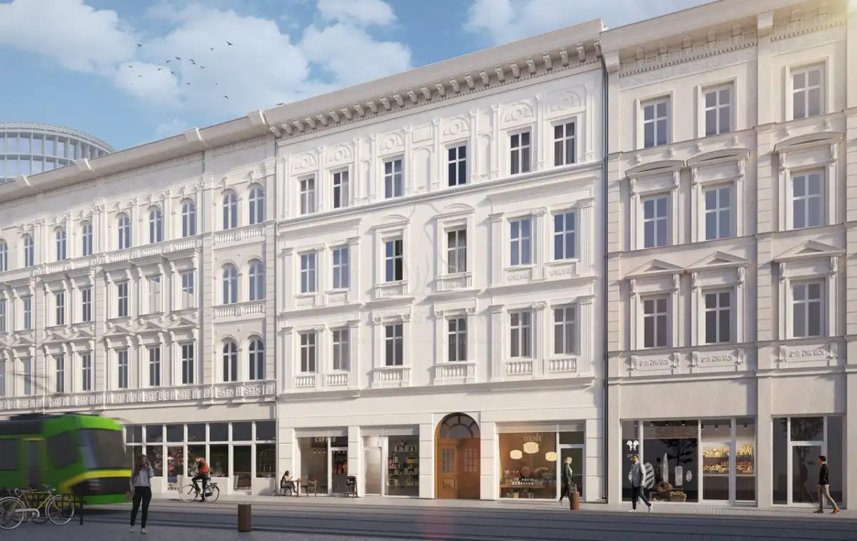 Elewacja kamienicy odzyska swój elegancki wygląd, podkreślony ozdobnymi gzymsami i dekoracyjnymi sztukateriami. Znowu widoczne będą dumne, uskrzydlone lwy zdobiące front budynku.