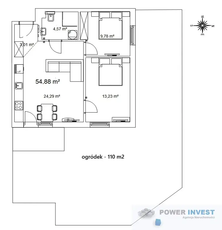 Mieszkanie znajduje się na parterze. Lokal ma powierzchnię 54,88 m² i składa się z: