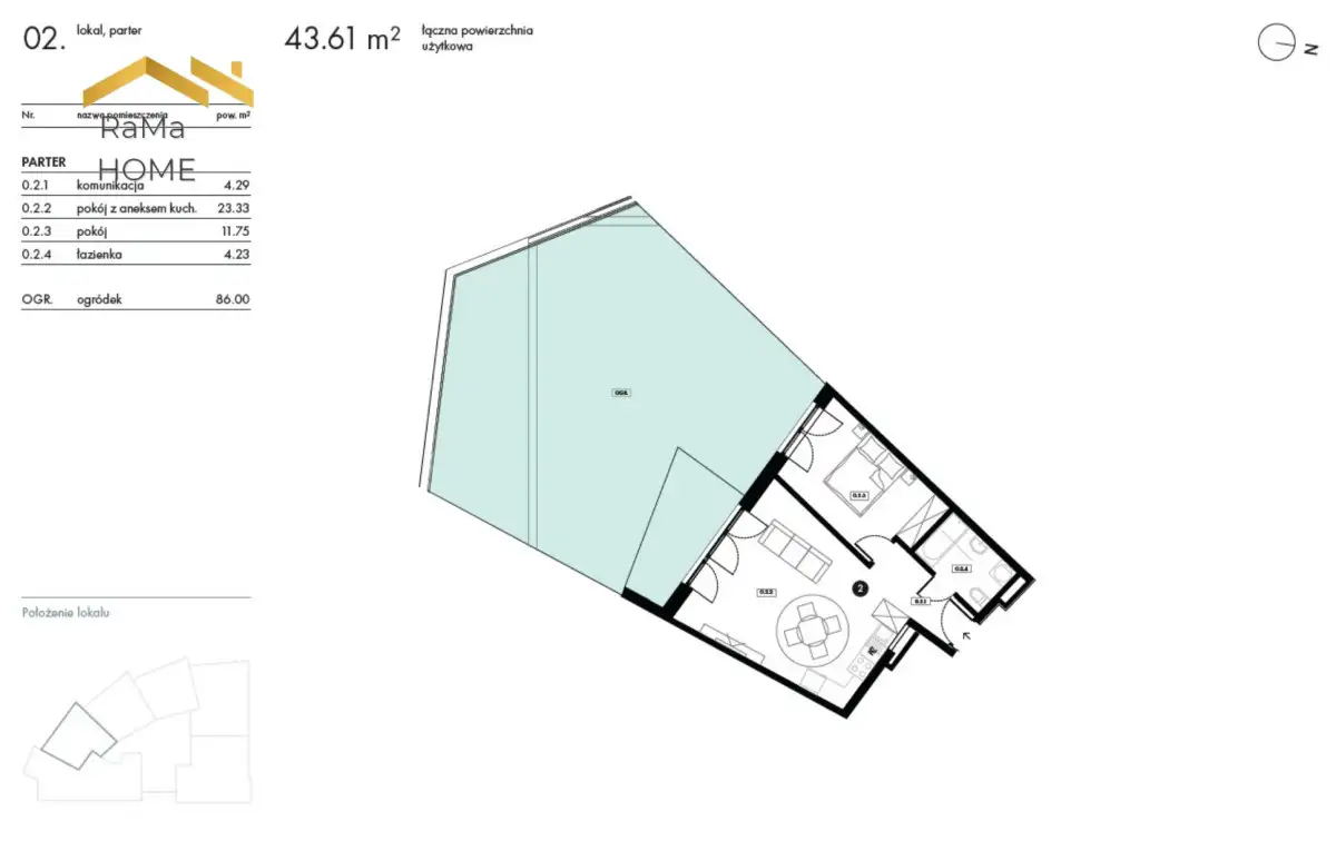 Parametry mieszkania:powierzchnia: 43,61 m²