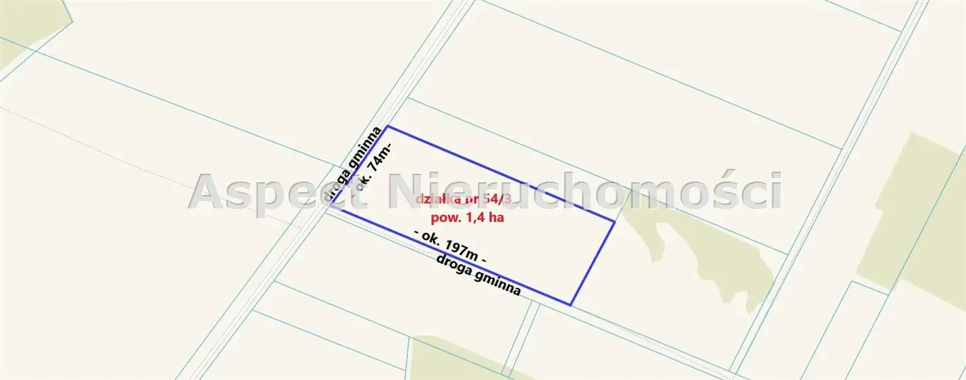 Działka o kształcie zbliżonym do prostokąta i przybliżonych wymiarach 74 m x 190 m oraz płaskim ukształtowaniu.