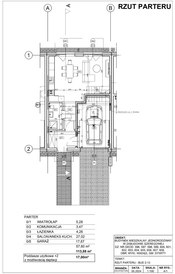 Każdy dom (dot. budynków od nr 2 do nr 13) o pow. projektowanej 113,88m² będzie składał się z :