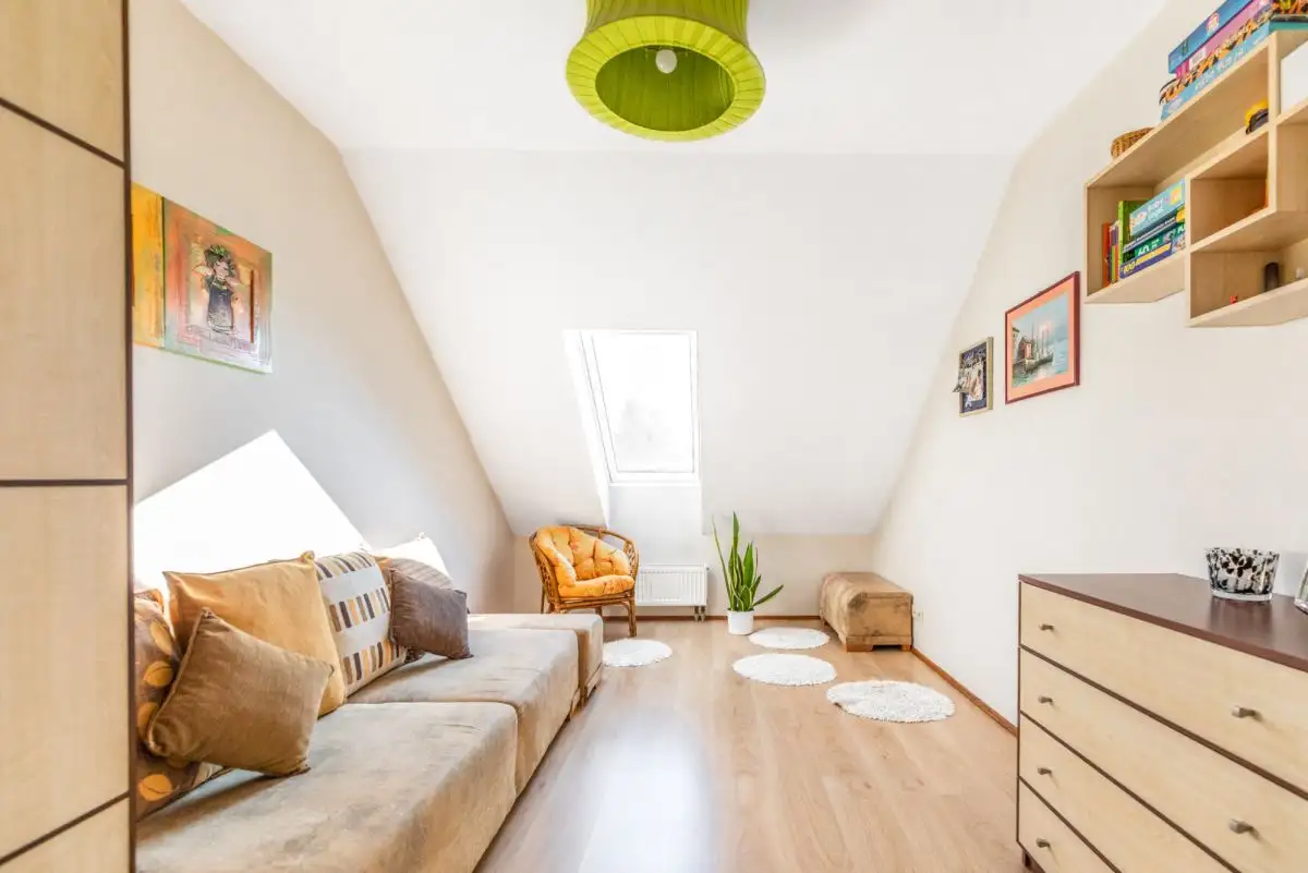 - pokój o pow. 17,7 m² z wyjściem do ogrodu.