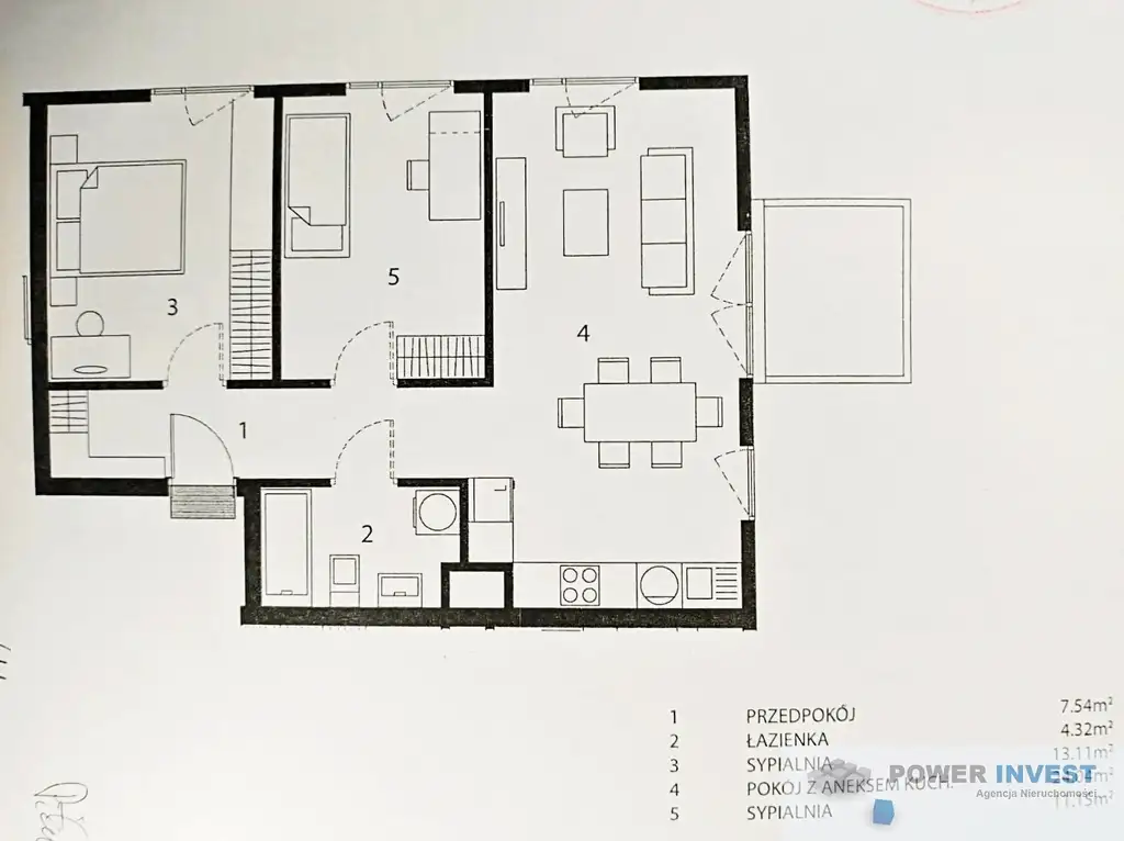 salon z aneksem kuchennym o pow. 24,04m² pokój o pow. 11,5 m² sypialnia o pow. 13,11 m²przedpokój o pow. 7,54 m² łazienka o pow. 4,32 m²