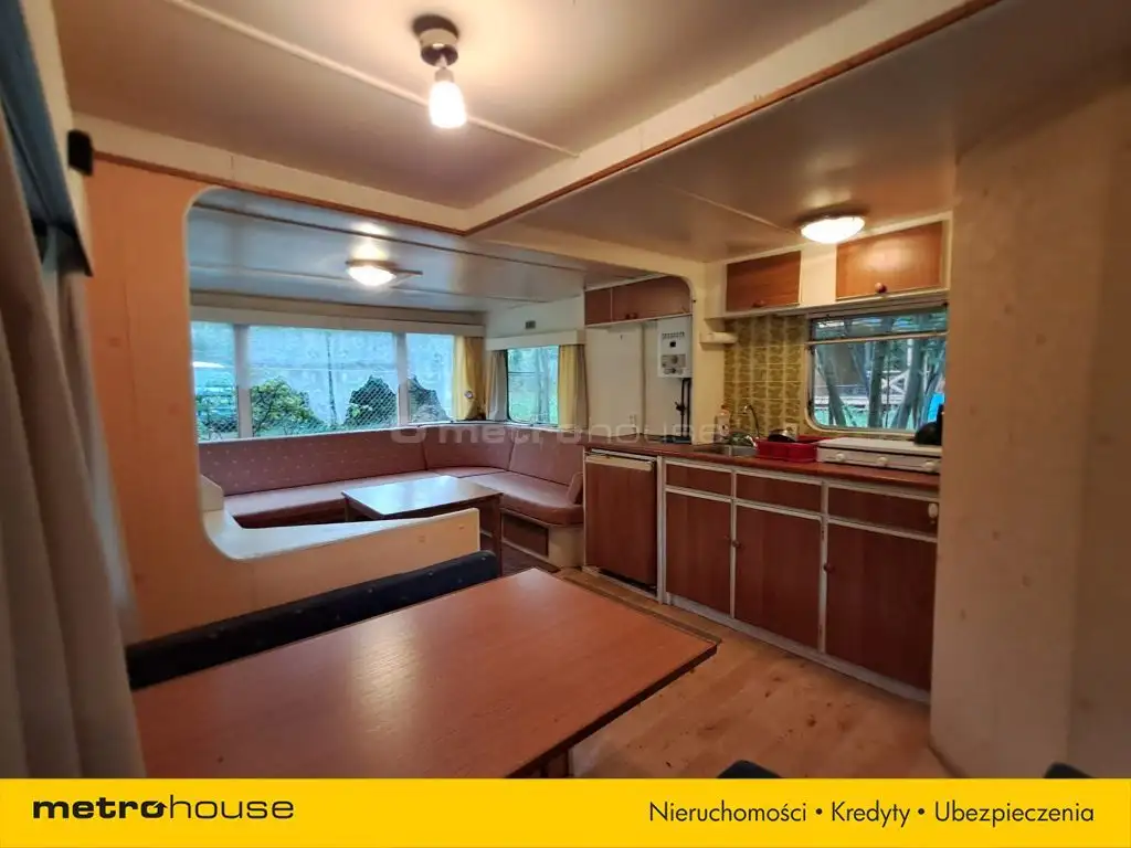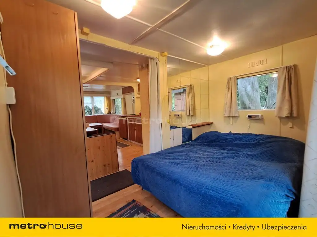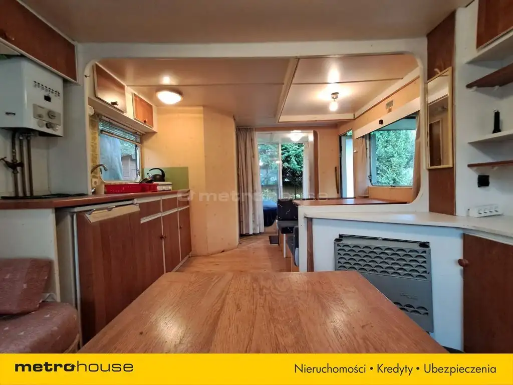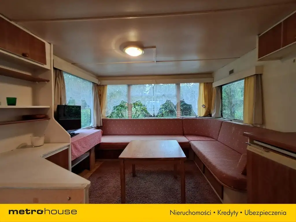 W środku: salon z dużymi oknami, sypialnia, aneks kuchenny i łazienka z wc.