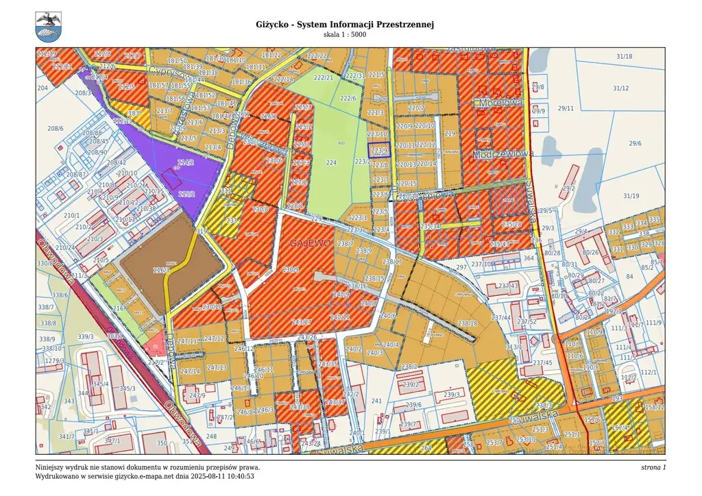 Nieruchomość jest objęta miejscowym planem zagospodarowania przestrzennego części terenów wsi Gajewo w gminie Giżycko zatwierdzonym Uchwałą Nr VIII/78/03 z dnia 14 maja 2003 roku, ogłoszoną w Dzienniku Urzędowym Województwa Warmińsko – Mazurskiego, nr 108, poz. 1446 z dnia 22 lipca 2003 roku. Zgodnie z powyższym planem przeznaczona jest pod teren zabudowy mieszkalnej jednorodzinnej i mieszkalno-usługowej, oznaczony symbolem 10MN/MNU.