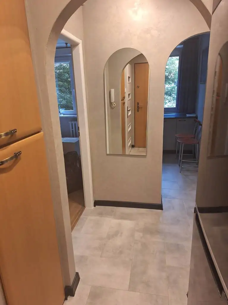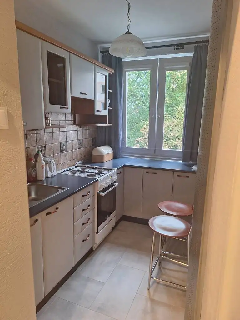 Mieszkanie zlokalizowane jest na I piętrze, czteropiętrowego bloku. Na 38m² mieszkania składają się dwa oddzielne pokoje (sypialnia oraz salon, każde osobno zamykane na klucz), osobna kuchnia, łazienka i przedpokój. Z salonu mamy bezpośredni dostęp do balkonu, o ekspozycji południowej. Sypialnia wyposażona w łóżko z materacem 160x200, szafę 140x220 i komodę. W salonie znajdziemy stół jadalniany z krzesłami, szafę wnękową 150x240, witrynę oraz komodę RTV. W łazience mamy wannę, pralkę (nowa na gwarancji), umywalkę z lustrem oraz WC. Kuchnia została wyposażona w niezbędne sprzęty AGD typu: kuchenka gazowo-elektryczna (nowa na gwarancji), lodówka z zamrażarką (nowa na gwarancji). Pod blokiem bardzo dużo miejsc parkingowych, co gwarantuje brak problemów z parkowaniem. Budynek jest wyposażony w monitoring.